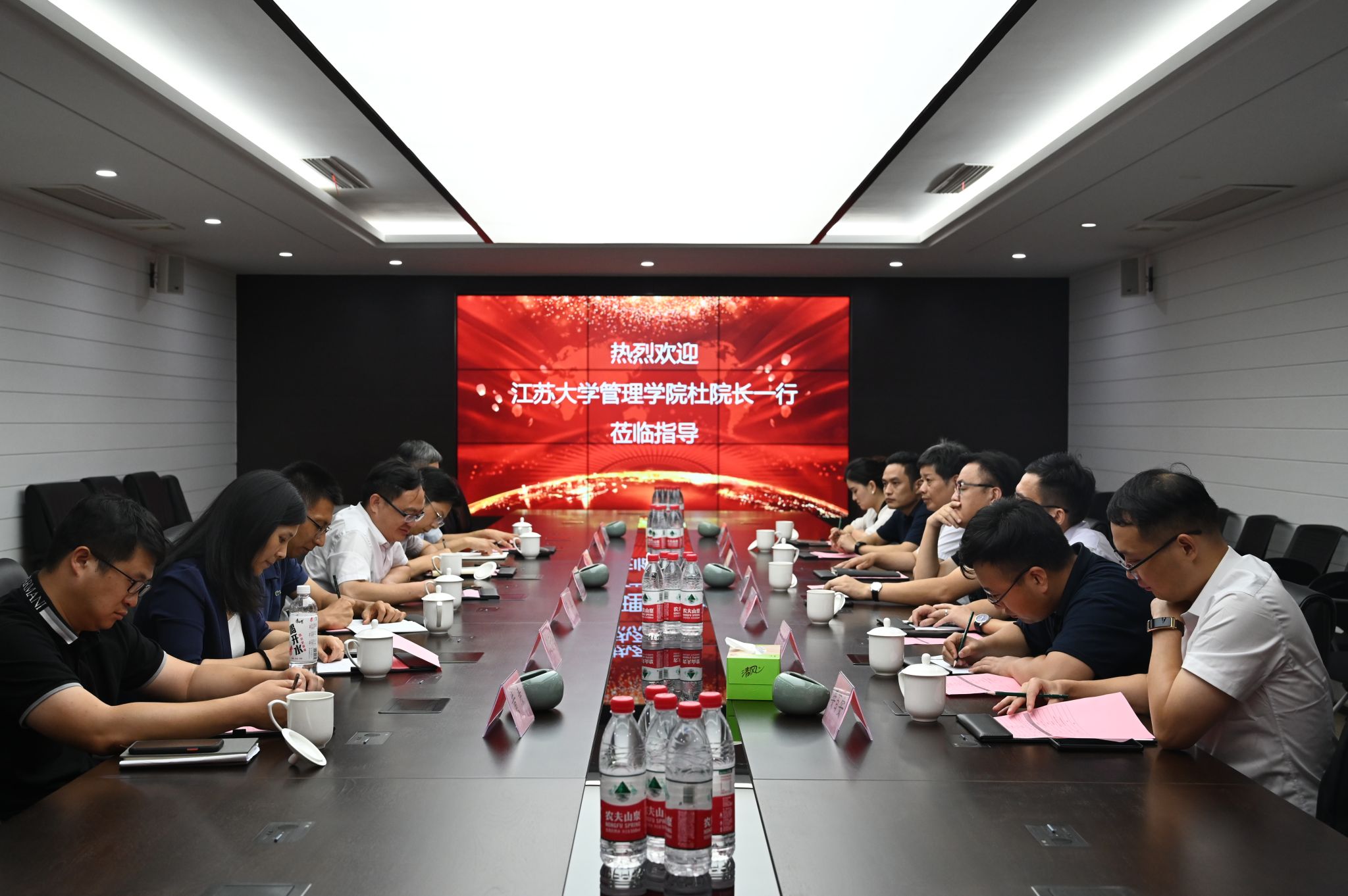 随后,杜建国一行前往无锡雪浪环境科技股份有限公司(300385),雪浪环境董事长、总裁胡建民(2016届MBA校友)、副总裁陈卓成、副总裁蒋洪元等共同接待了杜建国一行。胡建民从集团板块、产业分布、发展规划、研发成果以及取得的成绩等方面详细介绍了雪浪环境的发展近况。杜建国对雪浪环境在工业废气处理、资源化利用等领域为国家绿色环保事业做出的重要贡献表示了肯定,并介绍了学院的发展,特别是在绿色发展和循环经济研究方面取得的成绩。
